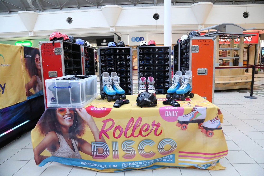 Sk8hire supplied a full Roller Rink Package, including rink branding for the Pavillion Shopping centre in Uxbridge. Over 2 weeks we provided an amazing roller disco party including music & lighting for over 4,000 skaters!!